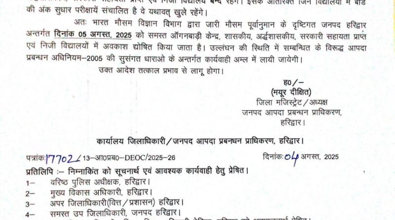 Read Moreडीएम मयूर दीक्षित ने किया विद्यालयों/आंगनबाड़ी केंद्रों में अवकाश घोषित हरिद्वार 04 अगस्त 2025– जिला मजिस्ट्रेट एवं जिलाधिकारी मयूर दीक्षित
