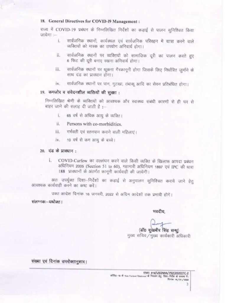 अतः उपर्युक्त दिशा-निर्देशों का कड़ाई से अनुपालन सुनिश्चित कराये जाने हेतु आवश्यक कार्यवाही करने का कष्ट करें। उक्त आदेश दिनांक 16 जनवरी, 2022 से अग्रिम आदेशों तक प्रभावी होंगे।