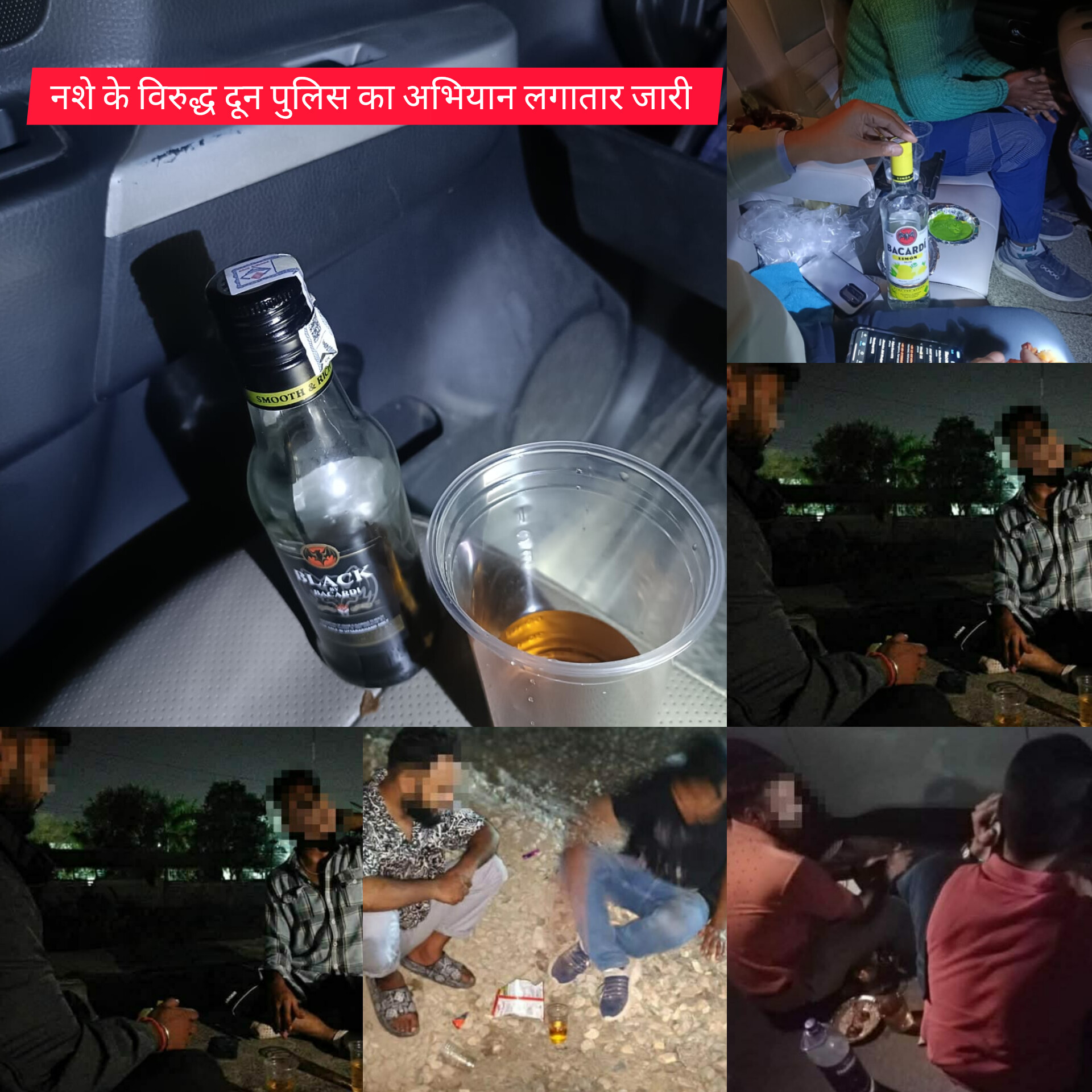 सड़क किनारे सार्वजनिक स्थानों पर शराब पीने तथा हुड़दंग करने वालों तथा शराब पीकर वाहन चलाने वालों के विरुद्ध दून पुलिस द्वारा लगातार व्यापक स्तर पर अभियान चलाया जा रहा है। अभियान के दौरान विगत 10 दिनों में पुलिस द्वारा सार्वजनिक स्थानों पर शराब पीने वाले 585 व्यक्तियों को थाने लाया गया, थाने लाये गये सभी व्यक्तियों के पुलिस एक्ट में चालान कर 1,87,000 (एक लाख सत्तासी हज़ार ) ₹ का जुर्माना वसूला गया, साथ ही सभी व्यक्तियों को सख्त हिदायत दी गई। विगत 10 दिनों के दौरान पुलिस द्वारा सार्वजनिक मार्गो पर शराब पीकर वाहन चलाने वाले 278 वाहन चालकों को गिरफ्तार किया गया, साथ ही उक्त सभी 278 वाहनों को सीज किया गया।