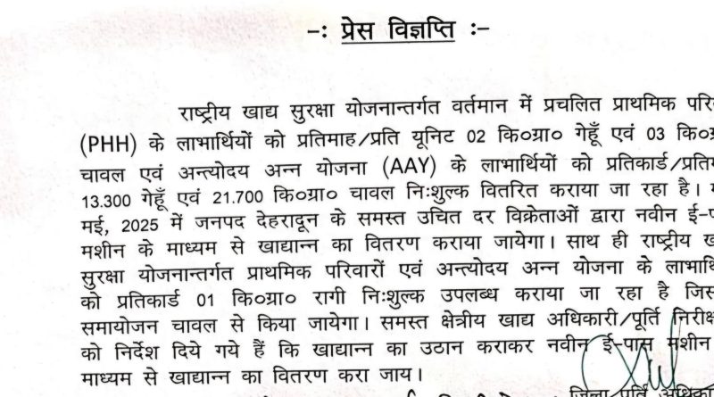 उत्तराखंड। राष्ट्रीय खाद्य सुरक्षा योजनान्तर्गत वर्तमान में प्रचलित प्राथमिक परिवार (PHH) के लाभार्थियों को प्रतिमाह/प्रति यूनिट 02 कि०ग्रा० गेहूँ एवं 03 कि०ग्रा० चावल एवं अन्त्योदय अन्न योजना (AAY) के लाभार्थियों को प्रतिकार्ड/प्रतिमाह 13.300 गेहूँ एवं 21.700 कि०ग्रा० चावल निःशुल्क वितरित कराया जा रहा है। माह मई, 2025 में जनपद देहरादून के समस्त उचित दर विक्रेताओं द्वारा नवीन ई-पास मशीन के माध्यम से खाद्यान्न का वितरण कराया जायेगा। साथ ही राष्ट्रीय खाद्य सुरक्षा योजनान्तर्गत प्राथमिक परिवारों एवं अन्त्योदय अन्न योजना के लाभार्थियों को प्रतिकार्ड 01 कि०ग्रा० रागी निःशुल्क उपलब्ध कराया जा रहा है जिसका समायोजन चावल से किया जायेगा। समस्त क्षेत्रीय खाद्य अधिकारी/पूर्ति निरीक्षकों माध्यम से खाद्यान्न का वितरण करा जाय।