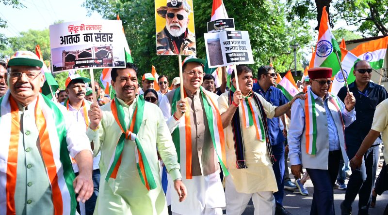 देहरादून । मुख्यमंत्री पुष्कर सिंह धामी के नेतृत्व में बुधवार को शौर्य स्थल चीड़बाग से गांधी पार्क तक भव्य “तिरंगा शौर्य सम्मान यात्रा” का आयोजन किया गया। यह यात्रा हाल ही में भारतीय सशस्त्र बलों द्वारा सफलतापूर्वक चलाए गए “ऑपरेशन सिंदूर” की ऐतिहासिक विजय को समर्पित रही। हजारों की संख्या में आमजन, पूर्व सैनिक, युवा वर्ग एवं मातृशक्ति ने तिरंगे के साथ पद यात्रा में भाग लिया। मुख्यमंत्री ने इस अवसर पर शौर्य स्थल पर पुष्प चक्र अर्पित कर शहीद जवानों को श्रद्धांजलि भी दी।