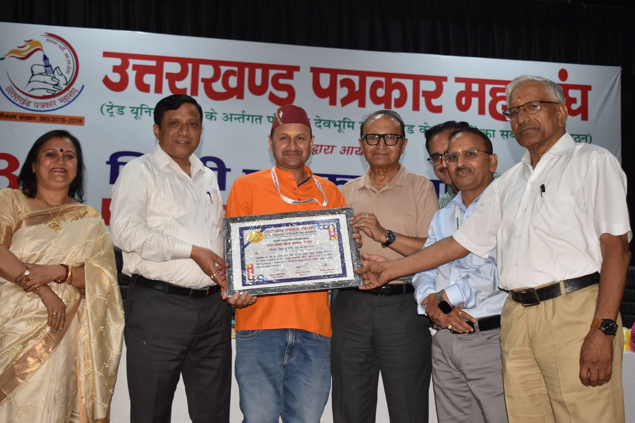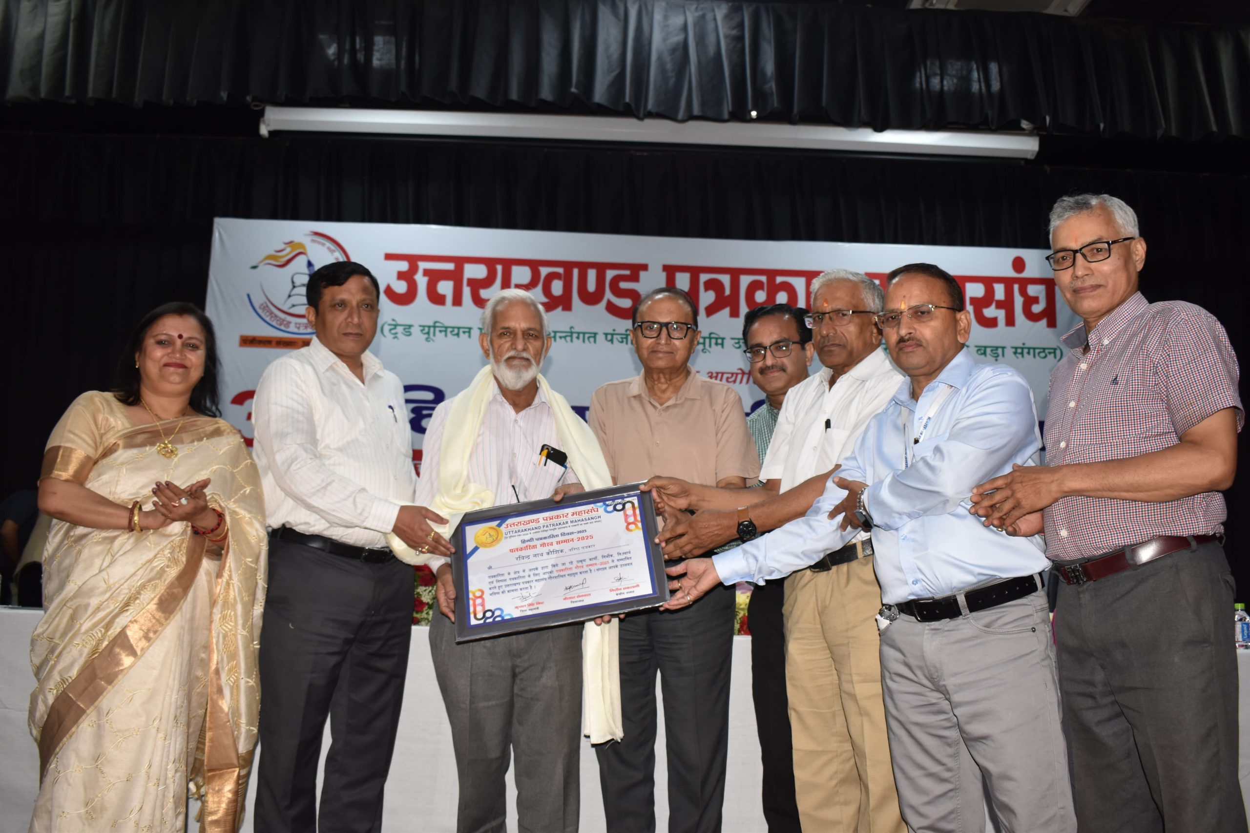 समारोह में उत्तरांखड पत्रकार महासंघ की ओर से देहरादून के वरिष्ठ पत्रकार रवीन्द्र नाथ कौशिक, राष्ट्रीय सहारा के सम्पादकीय प्रभारी राकेश डोमाल, अमर उजाला के भूपेन्द्र राणा हिन्दुस्तान के रवि बीएस नेगी दैनिक जागरण के विकास गुसाई, राष्ट्रसंत साप्ताहिक की सम्पादक श्रीमती बीना उपाध्याय, भारत नमन के सम्पादक नरेश रोहिला , दीप संवेरा के सम्पादक और महासंघ के प्रदेश कोषाध्यक्ष दीपक सिंह गुंसाई एवं विचार और चिंतन साप्ताहिक के सम्पादक राजेन्द्र सिंह सिरारी को पत्रकार गौरव सम्मान 2025 से सम्मानित किया। इन सभी को मुख्य वक्ता डा देवेन्द्र भसीन, विशिष्ट अतिथि सूचना महानिदेशक वंशीधर तिवारी विशिष्ट वक्ता डा वीडी शर्मा विशिष्ट अतिथि डॉ प्रो नीरज खत्री और उत्तराखंड पत्रकार महासंघ के अध्यक्ष निशीथ सकलानी ने शॉल ओढाकर तथा सम्मान पत्र प्रदान कर सम्मानित किया।