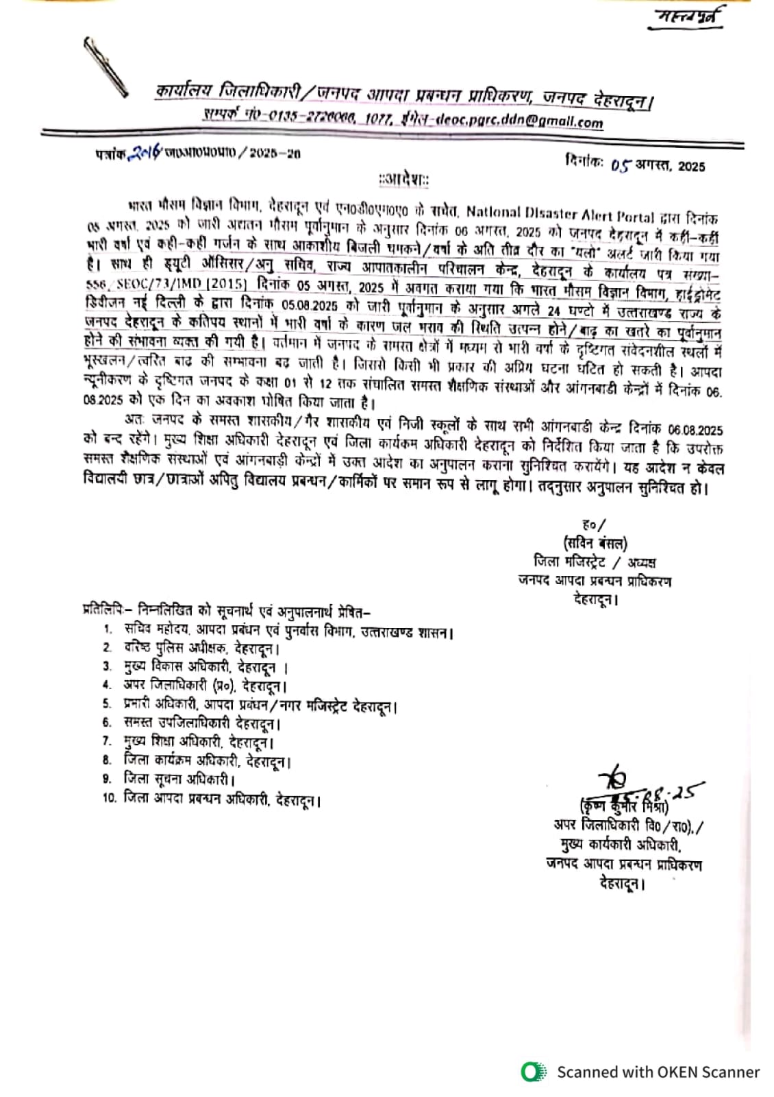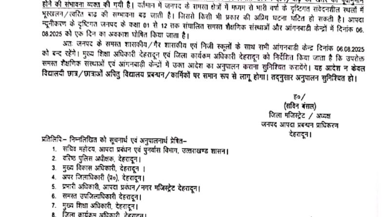 जनपद में आज सभी शिक्षण संस्थानों में रहेगा अवकाश डीएम देहरादून ने किया आदेश जारी