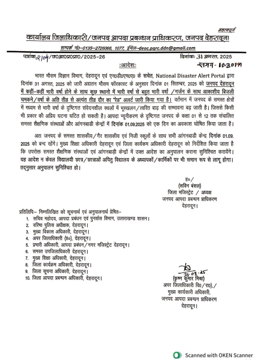 मौसम विज्ञान केंद्र, देहरादून के अनुसार देहरादून में भारी से बहुत भारी वर्षा का पूर्वानुमान है। इसके मद्देनजर देहरादून जनपद में 1 सितम्बर2025 सोमवार को सभी आंगनबाड़ी केंद्रों सहित कक्षा 1 से 12वीं तक के विद्यालयों में अवकाश घोषित किया गया है।