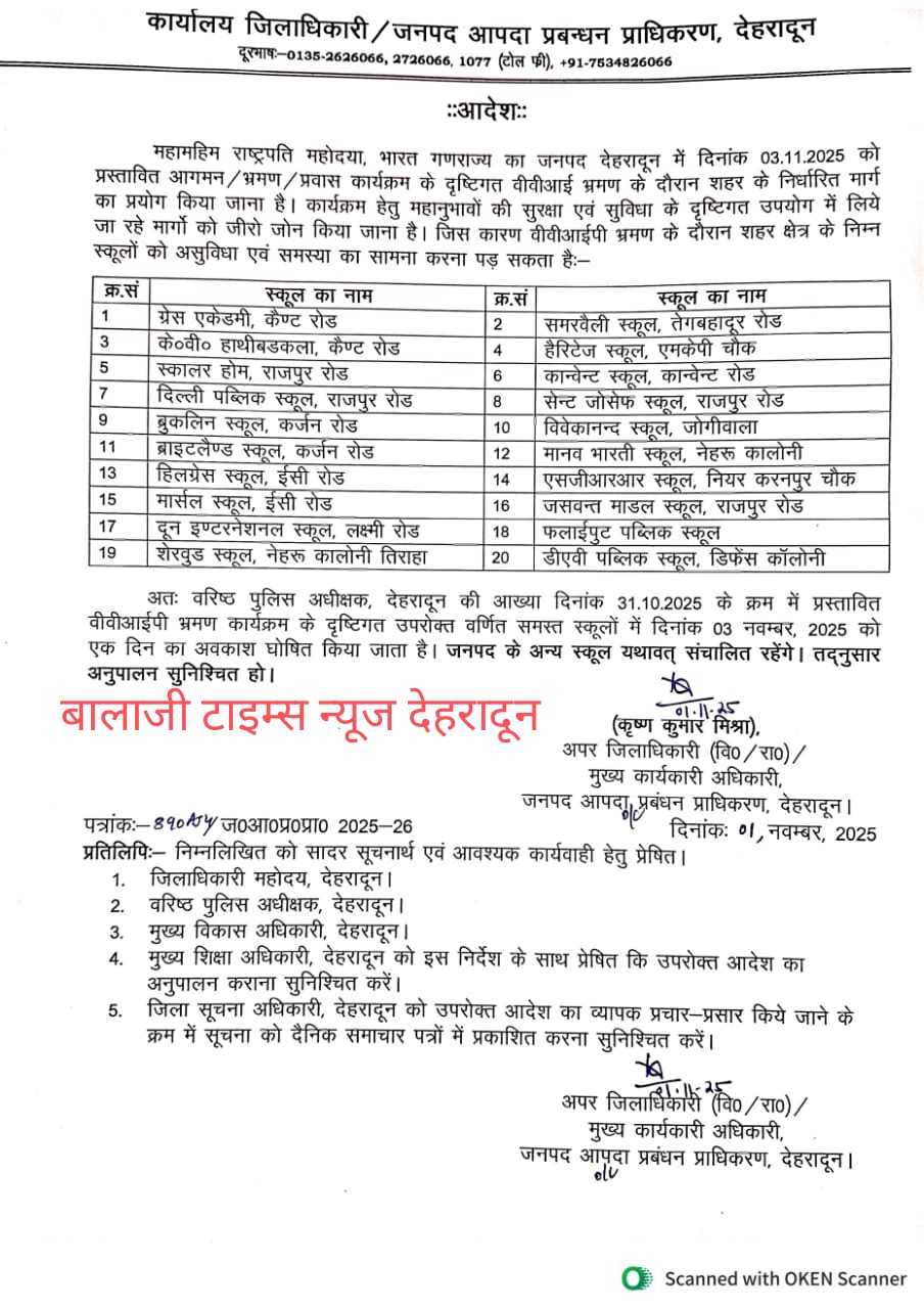 उत्तराखंड राष्ट्रपति के देहरादून भ्रमण कार्यक्रम के दृष्टिगत इन स्कूलों में रहेगा अवकाश November 1, 2025 Jagmohan Singh Maurya Spread the loveदेहरादून उत्तराखंड