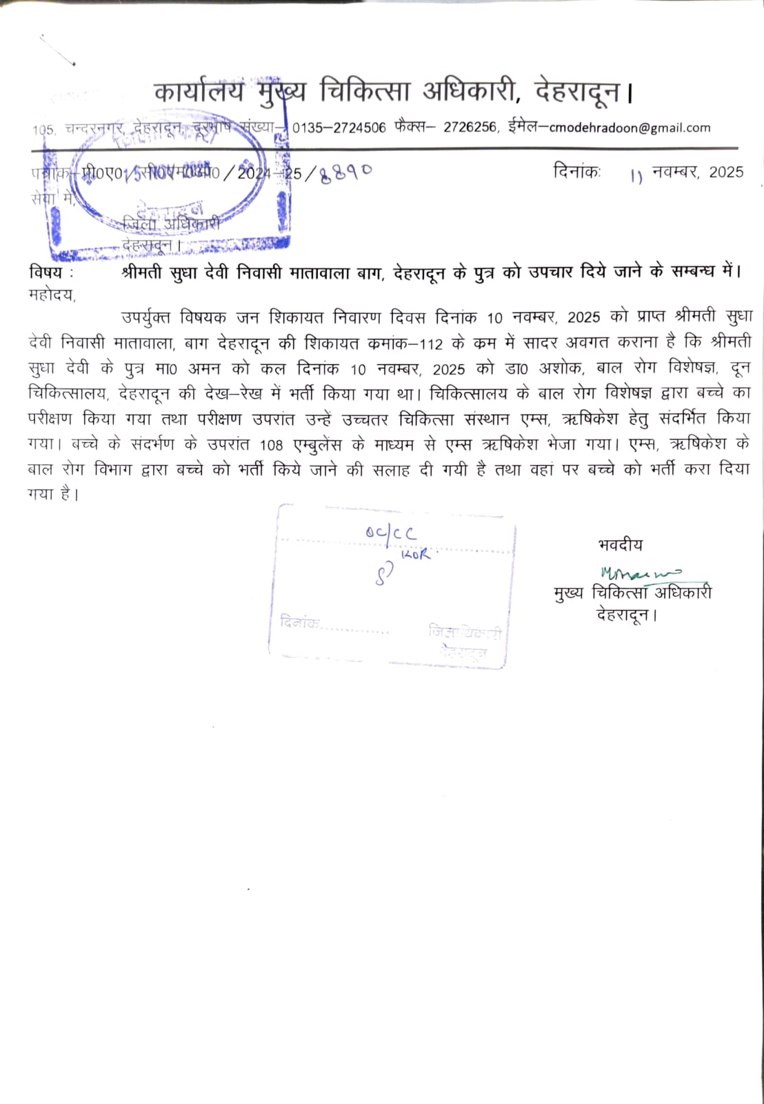 जिलाधिकारी ने मुख्य चिकित्साधिकारी को बालक का उपचार कराने के निर्देश दिए तथा उपजिलाधिकारी मुख्यालय को उपचार की मॉनिटरिंग एवं व्यवस्था करने को निर्देशित किया. साथ ही निर्देश दिए थे कि यदि सरकारी में उपचार संभव न हो तो बालक का उपचार निजी चिकित्सालय हायर सेंटर में विशेषज्ञ चिकित्सकों से कराया जाए. जिलाधिकारी के निर्देश पर 2 वर्षीय बालक अमन की जांच दून चिकित्सालय में करवाई गई तथा बालक अमन को उपचार हेतु एम्स चिकित्सालय को रेफर किया गया जहां बच्चे को उपचार हेतु भर्ती करा दिया गया है बच्चे का एम्स चिकित्सालय में विशेषज्ञ चिकित्सकों की देखरेख में उपचार किया जा रहा है.