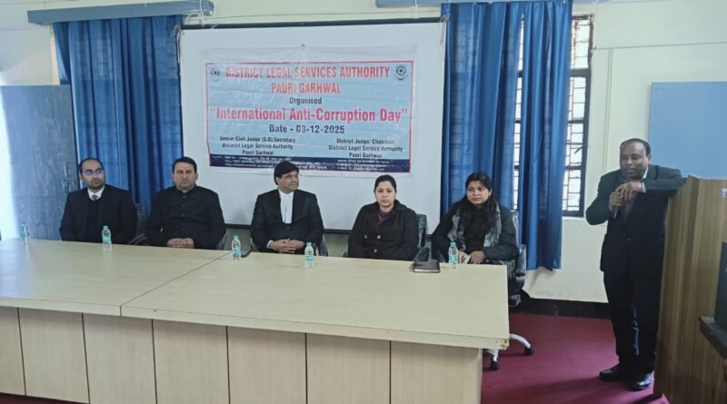 पौड़ी गढ़वाल । अंतर्राष्ट्रीय भ्रष्टाचार विरोधी दिवस के अवसर पर जिला न्यायालय परिसर सभागार कक्ष में मंगलवार को विधिक साक्षरता एवं जागरूकता शिविर का आयोजन किया गया। शिविर में नालसा थीम “एक मुट्ठी आसमान” के अंतर्गत लोकपाल तथा अंतर्राष्ट्रीय भ्रष्टाचार विरोधी दिवस से संबंधित लघु वीडियो प्रदर्शित की गयी।