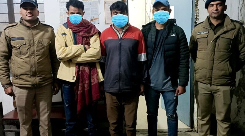 सूचना पर चौकी आराघर से पुलिस बल तत्काल मौके पर पहुंचा तथा मौके पर शराब पीकर हुड़दंग कर रहे 03 व्यक्तियों (1) अमित पुत्र रघुवीर निवासी कुबडू तहसील घनौर जिला सोनीपत हरियाणा (2) मोनू पुत्र अशोक निवासी किलाई पोस्ट रोहतक जिला हरियाणा (3) मोहित पुत्र जगबीर सिंह निवासी कुबडू तहसील घनौर जिला सोनीपत हरियाणा को हिरासत में लिया, जिन्हें थाने लाकर तीनो अभियुक्तों के विरुद्ध आवश्यक वैधानिक कार्यवाही की गई।