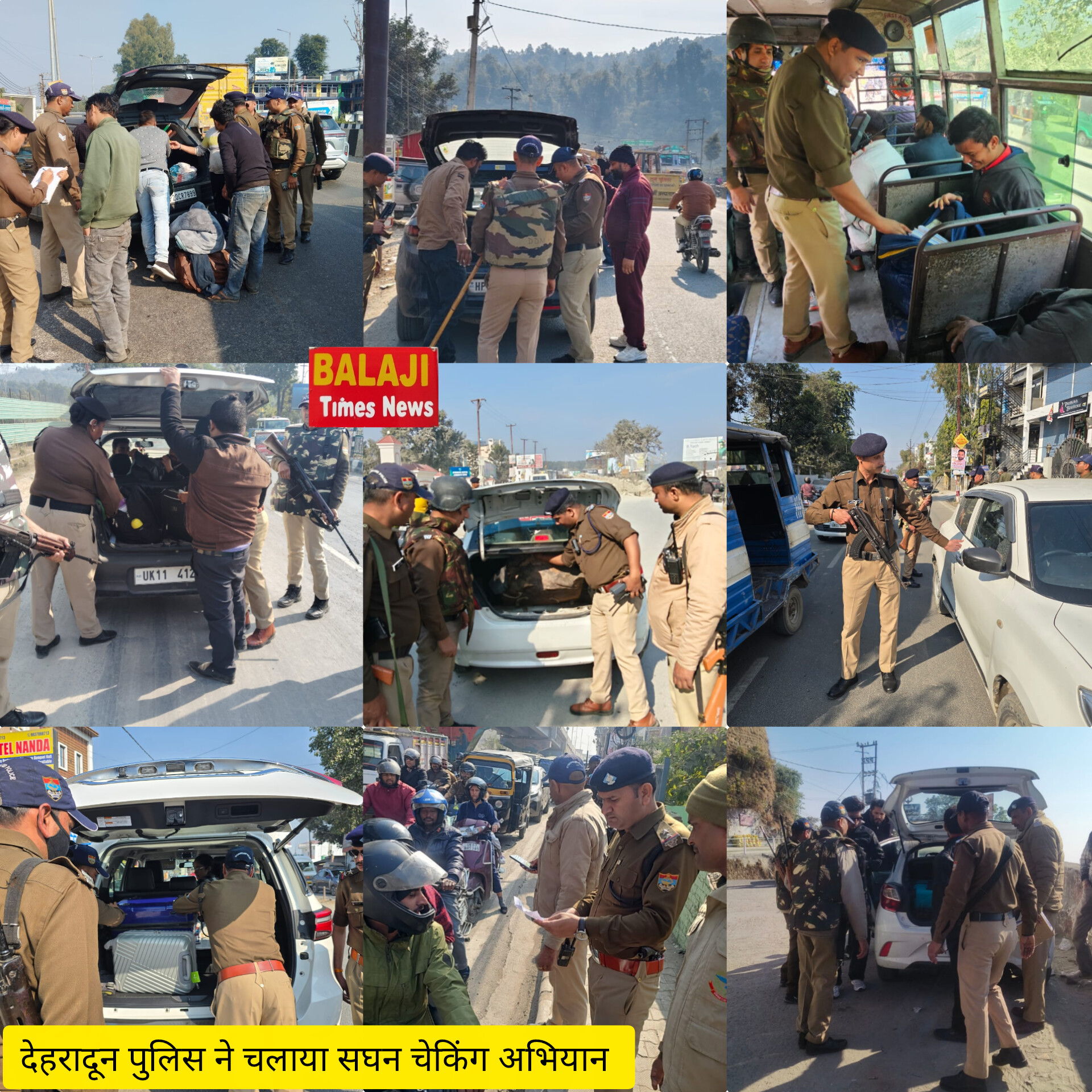 बालाजी टाइम्स न्यूज देहरादून उत्तराखंड । आम जन की सुरक्षा सुनिश्चित करने तथा संदिग्धों की तलाश हेतु एसएसपी देहरादून द्वारा सभी अधीनस्थों को अपने-अपने थाना क्षेत्रों संदिग्ध वाहनो/व्यक्तियों की तलाश हेतु नियमित चेकिंग के अतिरिक्त समय- समय पर अलग- अलग स्थानों पर वृहद स्तर पर आकस्मिक चैकिंग अभियान चलाये जाने हेतु निर्देशित किया गया है, जिसके अनुपालन में आज दिनांक- 12/12/2025 को जनपद के नगर तथा देहात के सभी थाना क्षेत्रों में सम्बन्धित क्षेत्राधिकारियों के नेतृत्व में पुलिस की अलग-अलग टीमो द्वारा सभी सीमावर्ती चैक पोस्टों/आन्तरिक मार्गाे, रेलवे स्टेशन, बस स्टेशनों, मॉल व भीड़ भाड़ वाले स्थानों पर भी आकस्मिक रूप से चेकिंग अभियान चलाया गया। अभियान के दौरान पुलिस द्वारा जनपद में प्रवेश करने वाले सभी व्यक्तियों/ वाहनो के साथ साथ डॉग स्क्वाड तथा बम डिस्पोजल टीम की सहायता से रेलवे स्टेशन, बस स्टेशन में यात्रियों/ वाहनों की सघन चेकिंग की गई, साथ ही भीड़ भाड़ वाले स्थानों, मॉल, शॉपिंग काम्प्लेक्स आदि स्थानों व उनके पार्किंग एरिया व आस पास के स्थानों में चेकिंग कर संदिग्ध रूप से घूम रहे व्यक्तियों से पूछताछ कर उनके सत्यापन की कार्रवाई की गई।