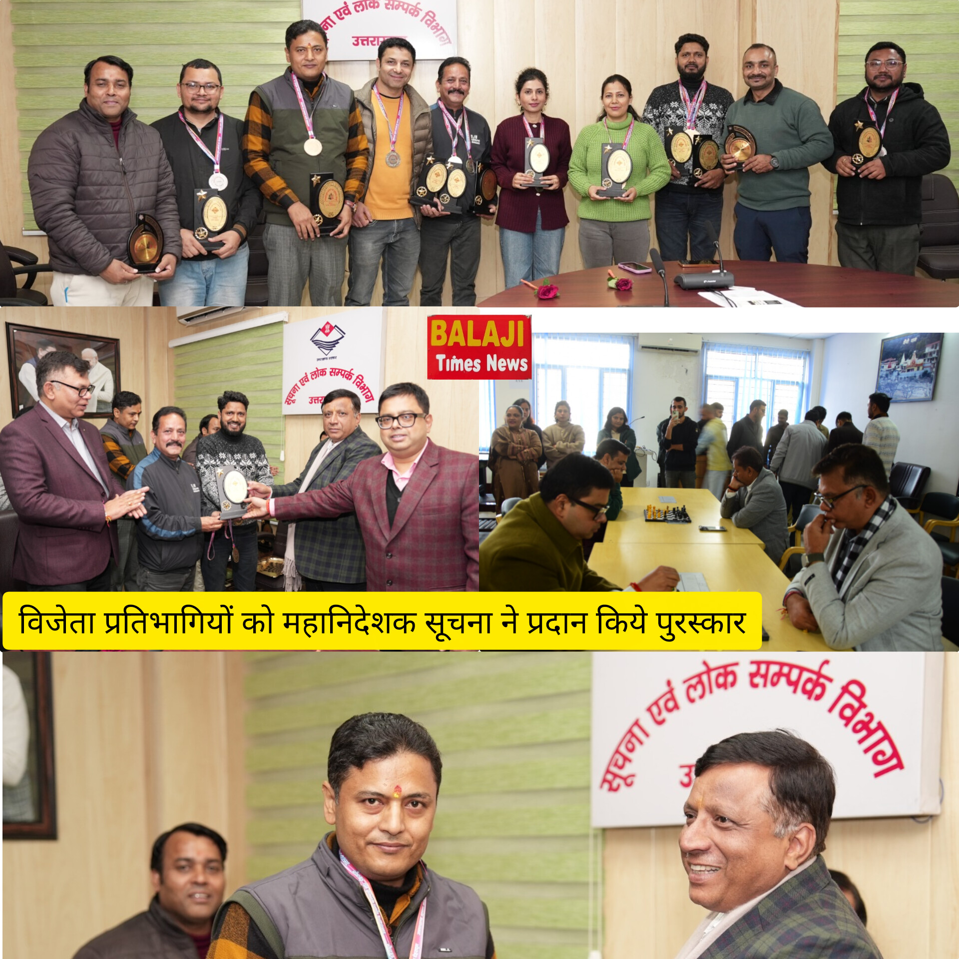 बालाजी टाइम्स न्यूज देहरादून 16 दिसम्बर 2025 उत्तराखण्ड सूचना कर्मचारी संघ (मुख्यालय), देहरादून द्वारा प्रथम इंडोर खेल प्रतियोगिता-2025 का आयोजन किया गया। मंगलवार को प्रतियोगिता के विजयी प्रतिभागियों को महानिदेशक सूचना श्री बंशीधर तिवारी द्वारा पुरस्कार प्रदान किये गये।