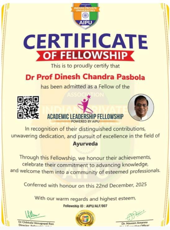 देहरादून: 28 दिसम्बर 2026 एसोसिएशन ऑफ इंडियन प्राइवेट यूनिवर्सिटीज (AIPU), गाजियाबाद , उत्तर प्रदेश, भारत द्वारा आयुर्वेद विभाग, उत्तराखंड के दो वरिष्ठ, काबिल एवं अनुभवी आयुर्वेद चिकित्सा अधिकारियों डॉ० प्रो० डी० सी० पसबोला और डॉ० अजय चमोला को “फेलोशिप इन आयुर्वेद (FAIPU)” उपाधि सम्मान प्रदान किया गया है। जिसके डाइरेक्टर, फेलोशिप अफेयर्स – डॉ० सी० वेणुगोपाल राव एवं चीफ एक्जीक्यूटिव आफिसर – डॉ० नवीन अमन्ना हैं