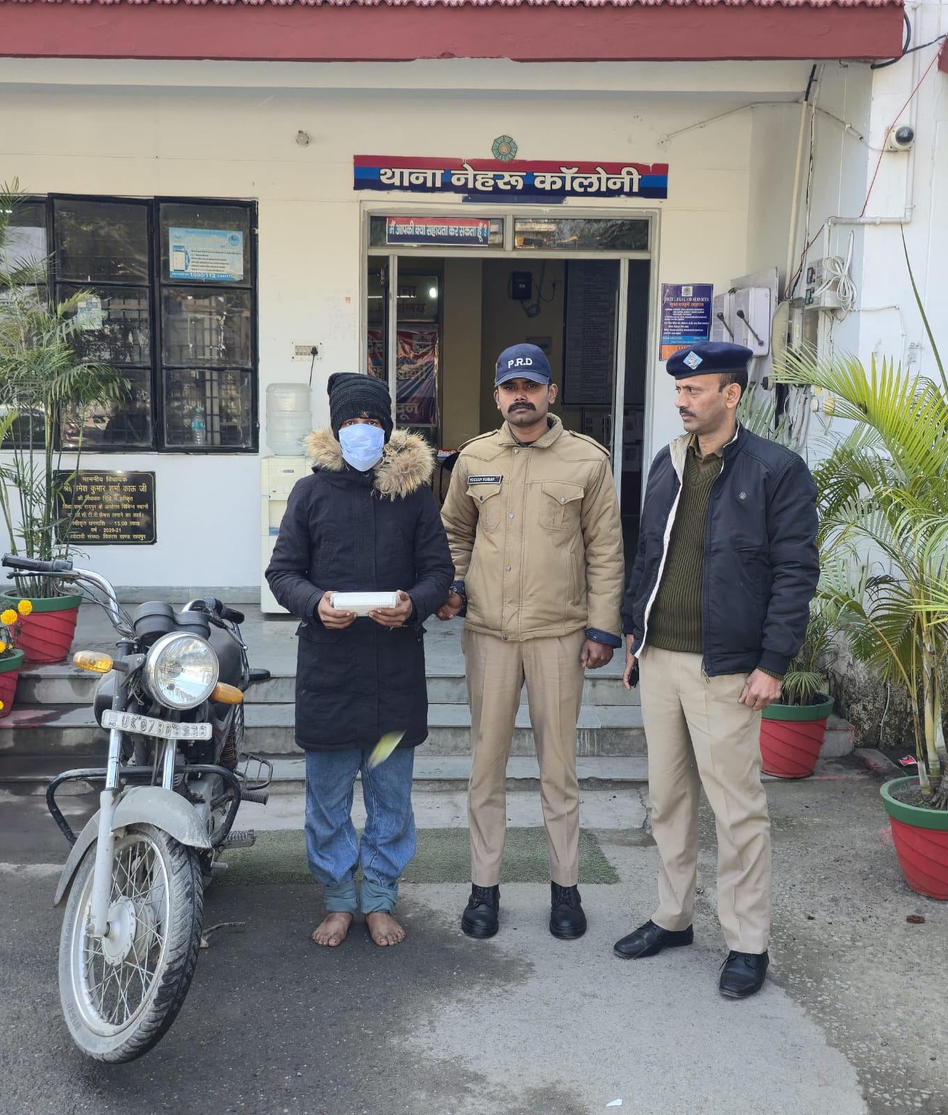 अभियुक्त की गिरफ्तारी तथा घटना के शीघ्र अनावरण हेतु वरिष्ठ पुलिस अधीक्षक देहरादून द्वारा थाना नेहरु कॉलोनी पर गठित पुलिस टीम को आवश्यक निर्देश दिए गए। गठित पुलिस टीम द्वारा सुरागरसी पतारसी करते हुए मुखबिर की सूचना पर दिनांक 1/1/26 को चेकिंग के दौरान अभियुक्त अमन कुमार को मोथरोवाला रोड से मो0सा0 CT100- UK07BQ8938 पर चोरी किये गए सामान के साथ गिरफ्तार किया गया। वाहन के बारे में पूछताछ करने पर अभियुक्त द्वारा उक्त मोटर साइकिल को उसने डिफेंस कॉलोनी क्षेत्र से चोरी करना बताया। जिसके संबंध में थाना नेहरू कॉलोनी पर पूर्व से मु0अ0सं0-410/25 पंजीकृत था।