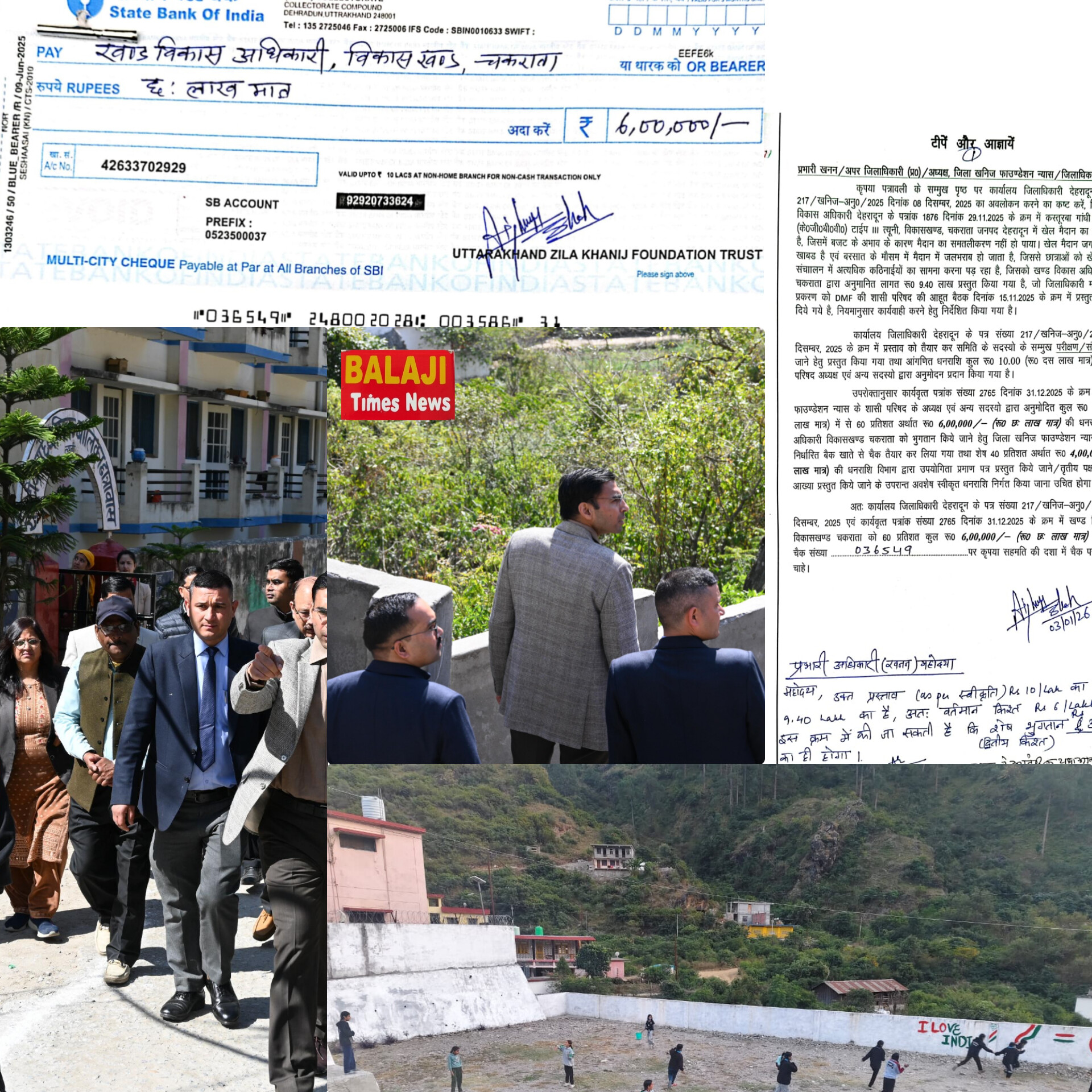 बालाजी टाइम्स न्यूज देहरादून, दिनांक 04 जनवरी 2026 जिलाधिकारी सविन बंसल ने कस्तूरबा गांधी बालिका विद्यालय (के०जी०बी०वी०) टाईप-I, त्यूनी, विकासखण्ड चकराता में खेल मैदान के समतलीकरण हेतु जिला खनिज फाउंडेशन न्यास (DMF) से कुल रु० 10.00 लाख की धनराशि स्वीकृत करते हुए प्रथम किस्त के रूप में रु० 6.00 लाख की धनराशि निर्गत की है।