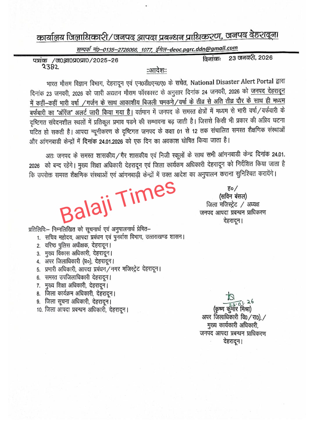 देहरादून। भारत मौसम विभाग देहरादून द्वारा एनडीएमए के सचेत नेशनल डिजास्टर अलर्ट पोर्टल द्वारा दिनांक 23 जनवरी 2026 को जारी मौसम फोरकास्टक के अनुसार दिनांक 24 जनवरी 2026 को अधिक वर्षा आकाशीय बिजली चमकने कहीं-कहीं गर्जना के साथ बर्फबारी होने की संभावना है जिसके दष्टिगत आंगनबाड़ी सहित कक्षा 1 से 12 तक के विद्यालयों में जिलाधिकारी देहरादून द्वारा एक दिवसीय अवकाश का आदेश जारी किया गया है।