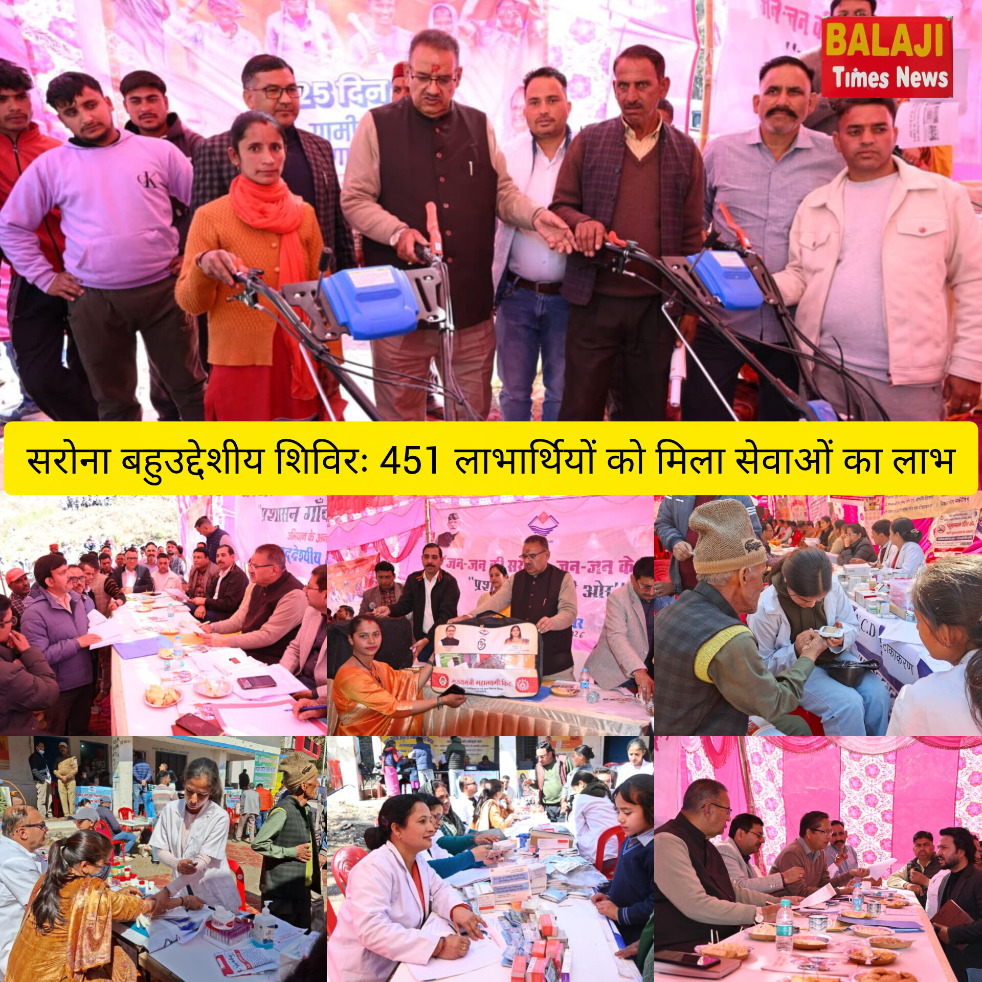 देहरादून 12 फरवरी 2026 “जन-जन की सरकार, जन-जन के द्वार” कार्यक्रम के अंतर्गत बृहस्पतिवार को विकासखंड रायपुर के दूरस्थ न्याय पंचायत सरोना में अपर जिलाधिकारी (वि.रा.) केके मिश्रा की अध्यक्षता में बहुउद्देशीय शिविर का आयोजन किया गया। शिविर मुख्य अतिथि कैबिनेट मंत्री गणेश जोशी ने विभिन्न विभागों द्वारा लगाए गए स्टालों का निरीक्षण करते हुए जन समस्यएं सुनी। इस दौरान विभिन्न विभागों के माध्यम से 451 लोगों को जनकल्याणकारी योजनाओं का प्रत्यक्ष लाभ प्रदान किया।