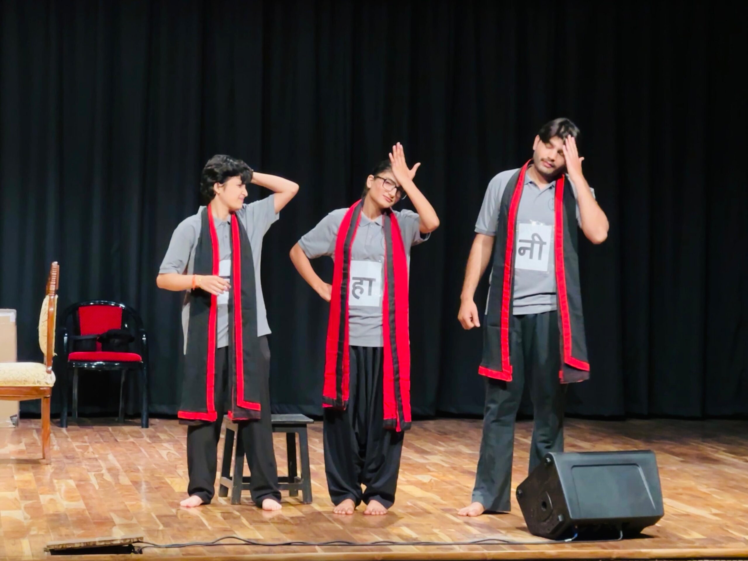नाटक में तीन कथावाचक—‘का’, ‘हा’ और ‘नी’—रहे, जो पूरे कथानक को रोचक ढंग से आगे बढ़ाते हैं। इसके साथ ही कई कलाकार शरारती अंदाज़ में अलग-अलग किरदारों में मंच पर आते हैं और कहानी में प्रवेश करने की कोशिश करते हुए हास्य और नाटकीयता का वातावरण रचते हैं।