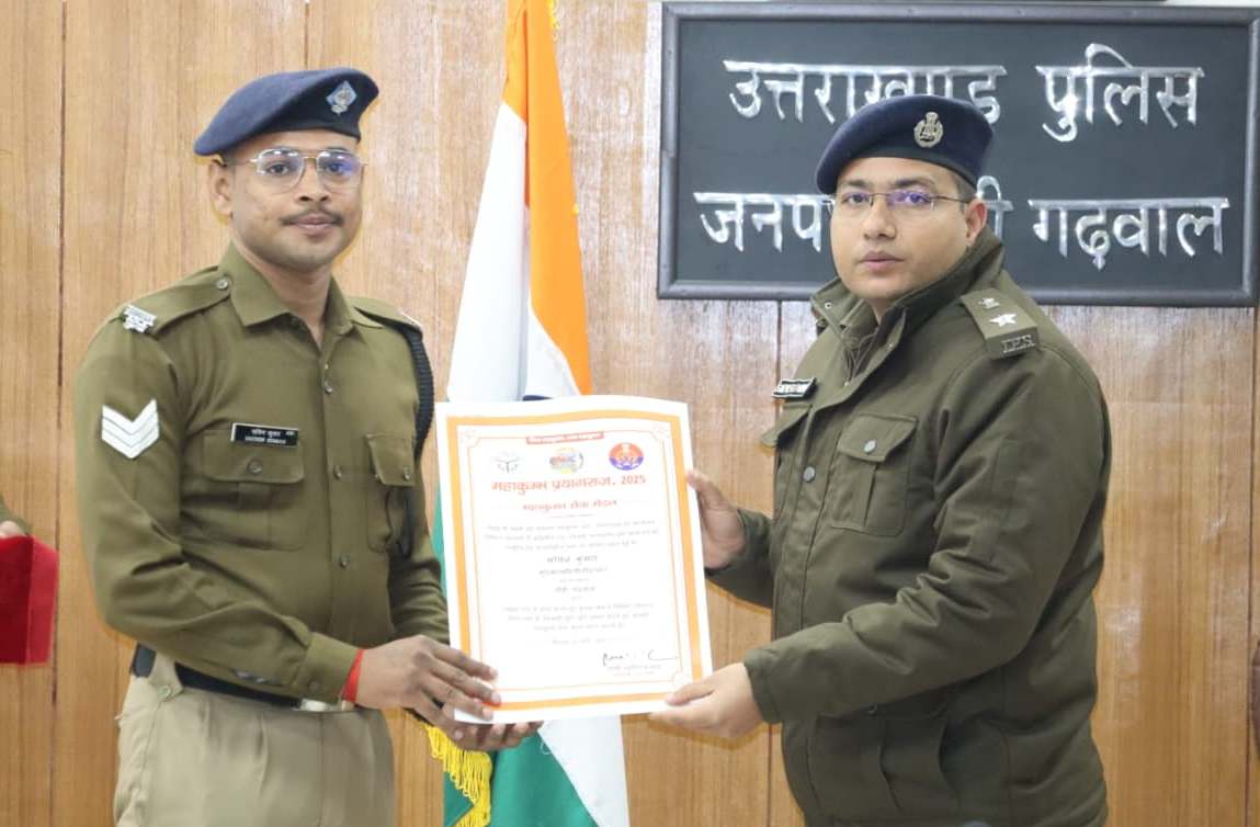 पौड़ी । वर्ष 2025 में प्रयागराज में आयोजित महाकुंभ मेला के दौरान कर्तव्य, समर्पण एवं अनुशासन की मिसाल पेश करते हुए पौड़ी पुलिस के मुख्य आरक्षी (दूरसंचार) सचिन कुमार, मुख्य आरक्षी (दूरसंचार) नितिन कुमार एवं अग्निशमन विभाग के पुष्पेन्द्र तोमर द्वारा इस महाकुंभ के दौरान अपनी जिम्मेदारियों का निर्वहन पूर्ण निष्ठा, सतर्कता एवं उत्कृष्ट कार्यशैली के साथ किया, जिसके परिणामस्वरूप उन्हें मा0 मुख्यमंत्री उत्तर प्रदेश द्वारा “महाकुंभ सेवा मेडल” से सम्मानित किया गया।