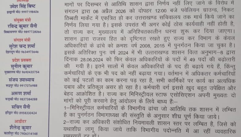 उत्तराखण्ड राज्य कर मिनिस्ट्रीयल स्टॉफ एसोसिएशन के लम्बित दो मागों पर दिसम्बर से आतिथि शासन द्वारा निर्णय नहीं लिए जाने के विरोध में संगठन द्वारा 06 अप्रैल 2026 को दोपहर 12:00 बजे पवेलियन ग्राउन्ड, निकट तिब्बती मार्केट में एकत्रित हो कर उत्तराखण्ड सचिवालय तक मार्च किये जाने का निर्णय लिया गया है। इसके उपरांत भी अगर कोई ठोस कार्यवाही नहीं होती है, तो राज्य कर, मुख्यालय में अनिश्चितकालीन धरना शुरू कर दिया जाएगा।