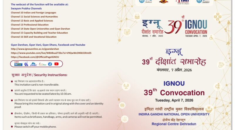 देहरादून । इंदिरा गाँधी राष्ट्रीय मुक्त विश्वविद्यालय का 39 वाँ दीक्षांत समारोह दिनाँक 07 , अप्रैल 2026 को आयोजित किया जायेगा । दीक्षांत समारोह का मुख्य कार्यक्रम इग्नू मुख्यालय, नई दिल्ली परिसर में आयोजित किया जाएगा जिसके मुख्य अतिथि भारत के माननीय उपराष्ट्रपति श्री सी.पी. राधाकृष्णन जी तथा विशिष्ट अतिथि दिल्ली के माननीय उपराज्यपाल श्री तरनजीत सिंह संधू जी होंगे । मुख्यालय के साथ-साथ यह कार्यक्रम देशभर में इग्नू के 51 क्षेत्रीय केन्द्रों पर भी आयोजित किया जाएगा।